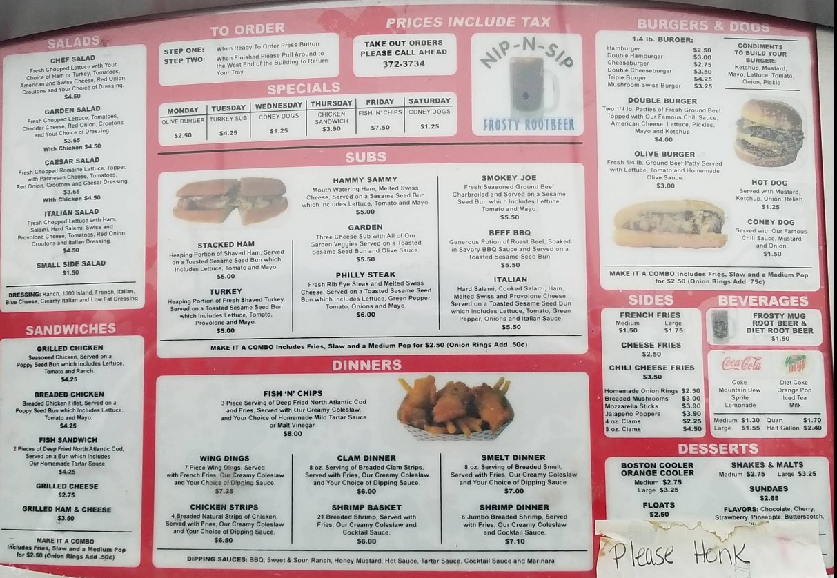 Step into the nostalgic charm of Nip N Sip Drive In, a beloved Lansing landmark serving classic American comfort food since 1960. Our Nip N Sip Restaurant menu in English brings you everything from juicy burgers and crispy wings to hearty subs, fries, chili, and thick hand-spun shakes. Whether you're craving a quick drive-thru meal or a satisfying dine-in experience, our menu offers something delicious for everyone. Explore our updated prices, customer favorites, and timeless flavors that keep locals coming back for generations.